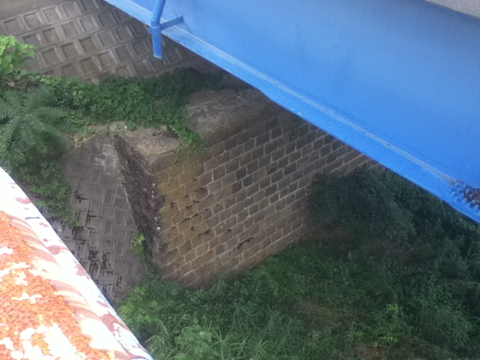 ▼山田川にかかる橋。当時の橋脚の一部が残る。