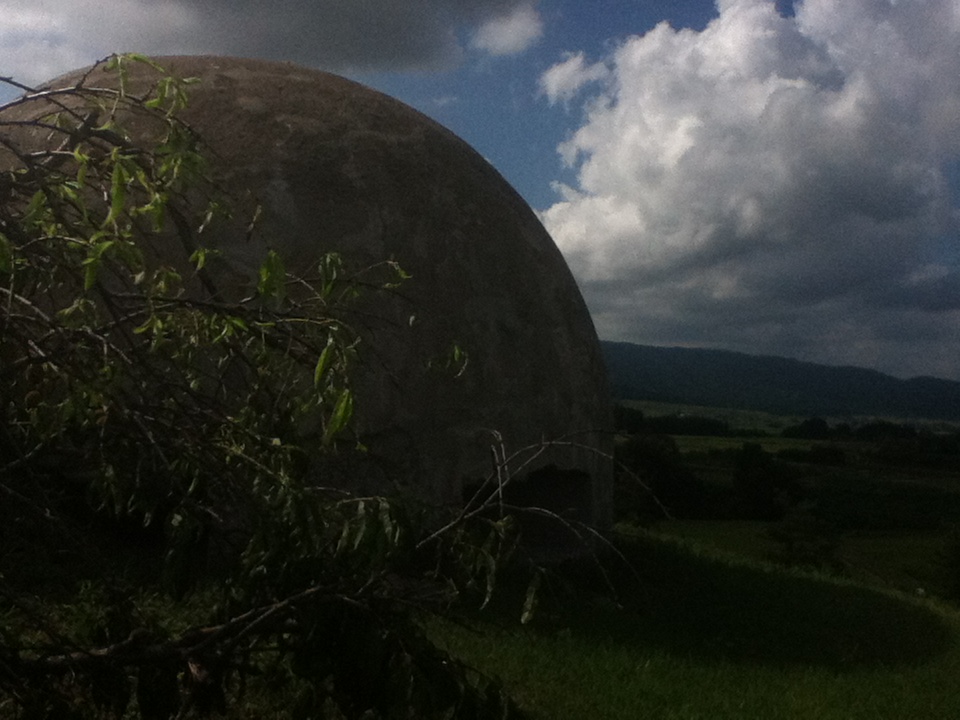 ▼兵舎のある丘の方を振り返る。かつてはあの丘に沿って演習場施設が並んでいました。
