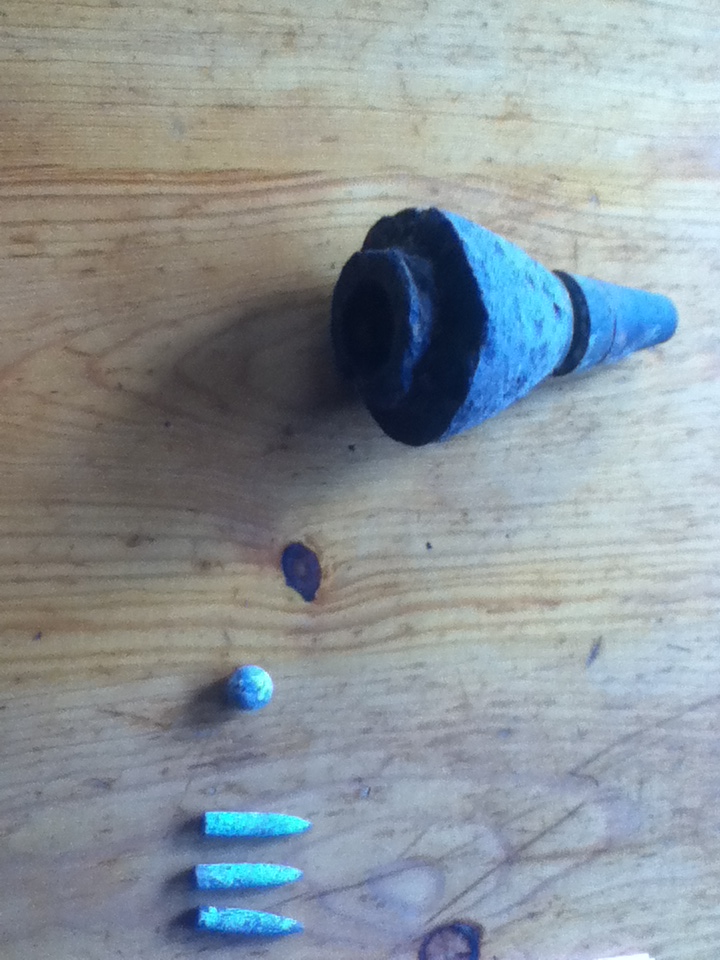 七十五粍砲弾の弾頭、榴散弾(人馬殺傷弾)の鉛玉、小銃弾