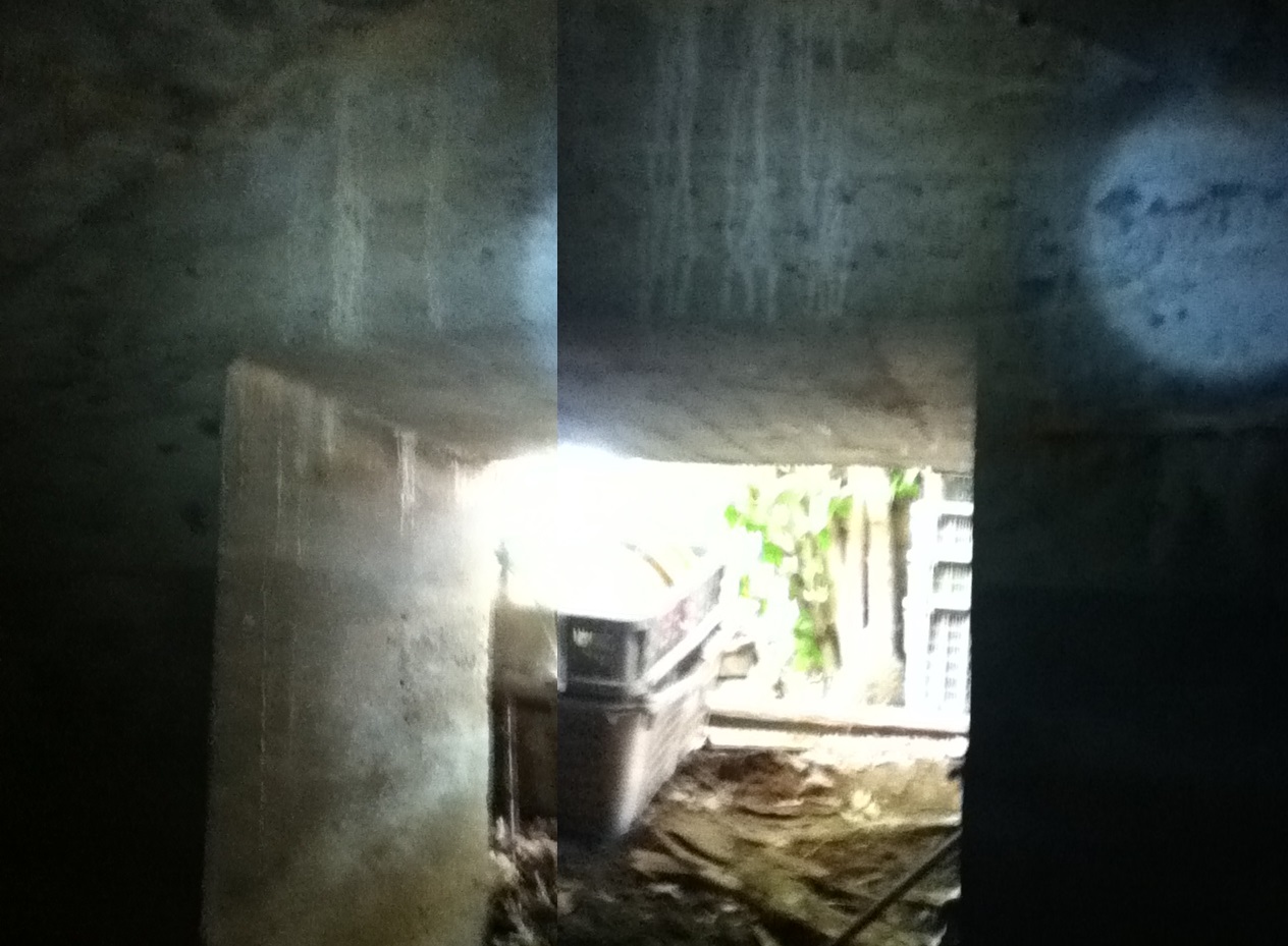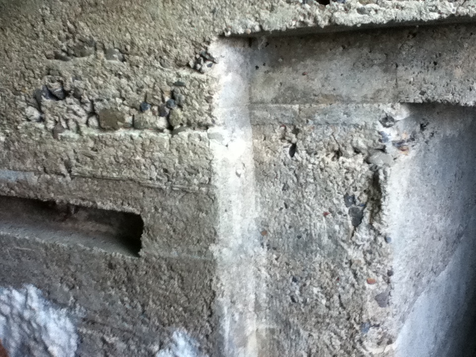 ▼戦時中の建造物に多い、砂利が多いコンクリートです。
