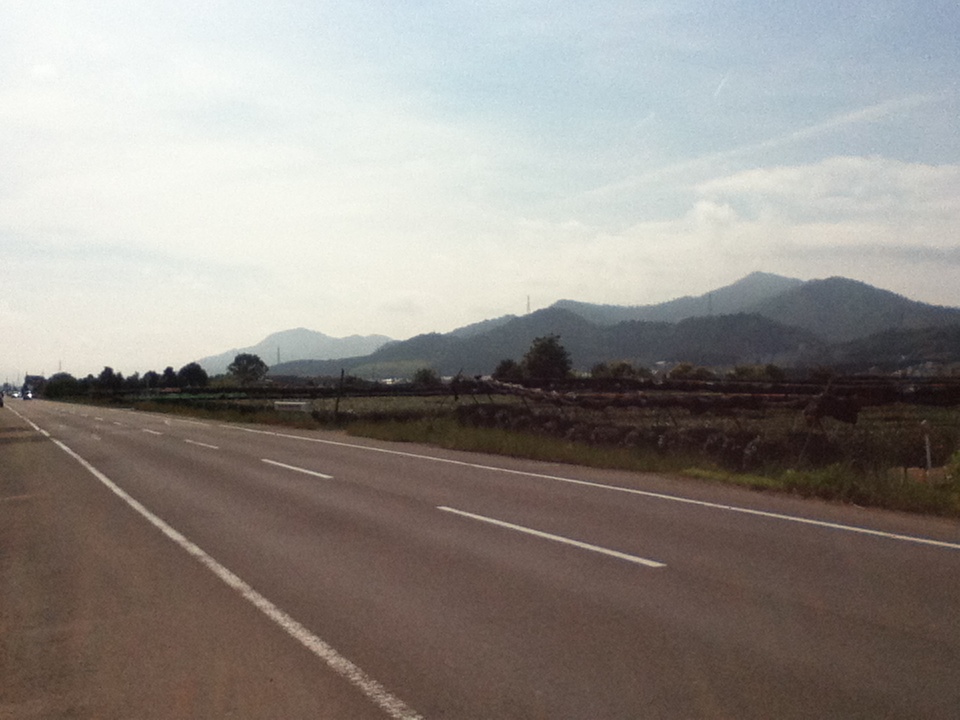 かつての滑走路上を道路が通っています。二車線ですが、道路幅は広く、今でも飛行機の発着ができそうです。